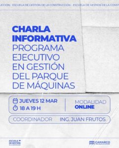 Ante estos desafíos, la Escuela de Gestión invita a participar de una charla informativa sobre el Programa Ejecutivo en Gestión del Parque de Máquinas, donde se presentará el enfoque y los contenidos de esta formación integral. Durante el encuentro se abordarán los ejes principales del programa, incluyendo gestión operativa, mantenimiento, calidad, seguridad y ambiente, aspectos financieros, marco legal, mecánica de la maquinaria y control de obras.